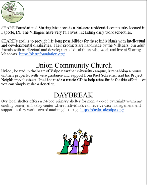 Shelter and Gabriel’s Horn continue to thrive. Use your weekly worship giving envelope with check to CLC and indicate “Daybreak” or “Gabriel’s Horn” or contribute through Subsplash on the CLC website clcvalpo.org via the “Give”