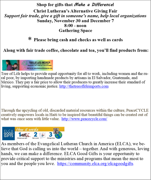 Space on Sunday, November 30 and December 7, from 8-noon. Shop for ways to support fair trade, charitable organizations and local ministries. More details coming!