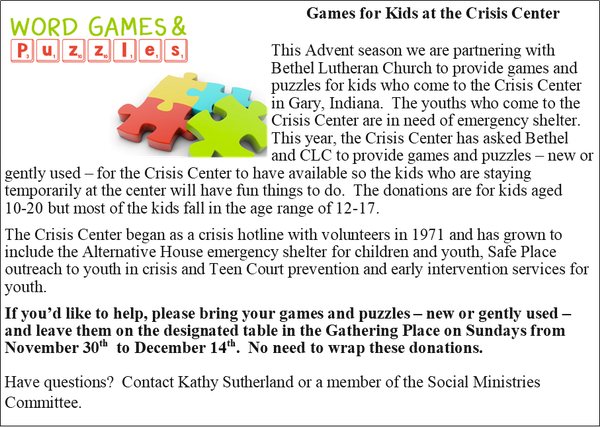 the God of Jesus Christ truly is present as they regularly gather in fellowship around his Word and sacraments”. CLC has partnered with Bethel over many years, including our 5th joint worship service at a Gary park this past summer, and it is wonderful to further build relationships with a sister congregation. In December CLC and Bethel are partnering on a donation project with the Crisis Center in Gary.