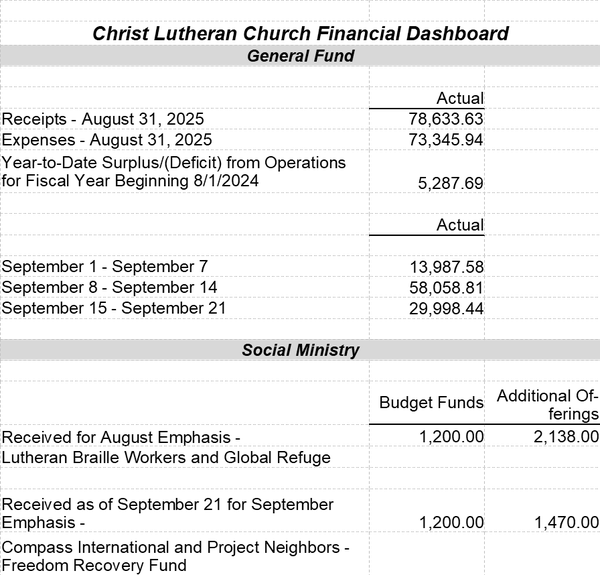 Personal Incentive Accounts (e.g. home/business ownership), Emergency Grants (e.g. unforeseen reduction in income), and Legal/Advocacy Assistance (e.g. generating wills/trusts and estate planning to help build legacy of wealth). The FRF aims to engage a network of community leaders who share a common goal of improving the quality of life of Black community members in Valpo. Help achieve our goal of $2500 in September (over and above giving combined with CLC’s $1200 budgeted amount). By achieving our goal CLC will help Compass and Project Neighbors Freedom Recovery Fund continue mutual support and service activities that are crucial to effective ministry. Use your weekly worship giving mailed in check to CLC and indicate “Compass/FRF” or contribute through Subsplash on the CLC website https://clcvalpo.org via the “Give” button and choose Monthly Social Ministry Emphasis. Thank you to members for supporting monthly social ministry emphases. Additional Opportunities: Northwest Indiana Lutheran Food and Supply Pantries Donations. Daybreak Men’s Shelter and Resale Shop https://newcreationresaleshop.com at 2102 Calumet