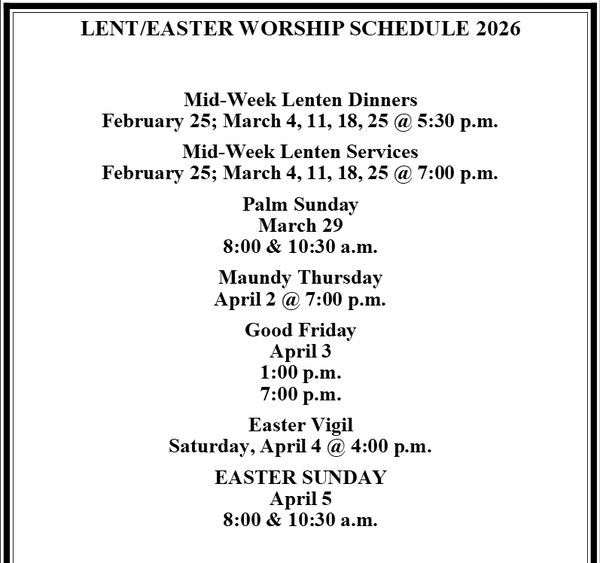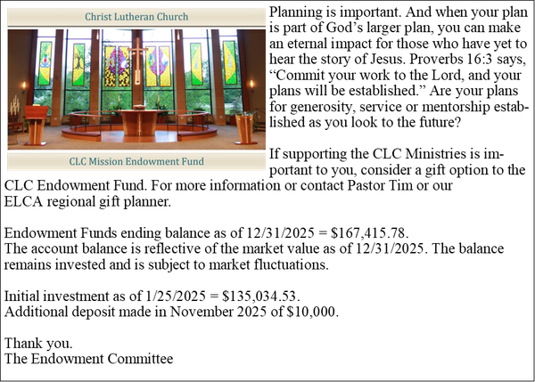 2026 Lenten Dinners at CLC!!! During Lent, you are invited to join in Lenten dinners at 5:30 p.m. Wednesdays at CLC, before each 7:00 p.m. evening service. Please sign up for each meal in advance in the East Link so that the cooks know how many to expect, and consider bringing a dessert to share. A free-will offering will be collected at each meal. Come and join in the fellowship! Dinner schedule: February 25 ~ Hospitality